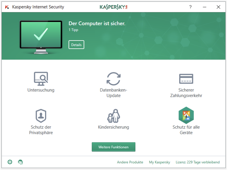 Sie können surfen, shoppen und soziale Netzwerke nutzen – auf PC, Mac und Mobilgeräten, während Kaspersky Internet Security Sie vor Infektionen, Ransomware, Phishing und Identitätsdiebstahl schützt.